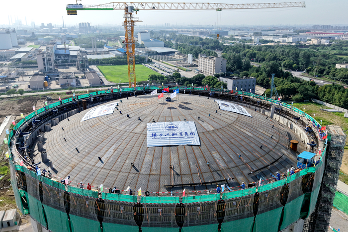 該項目單臺LNG儲罐拱頂重量達463噸,氣壓頂升作業(yè)屬超過一定規(guī)模的危險性較大的分部分項工程,技術難度與風險管控要求極高。集團統(tǒng)籌資源,聯(lián)合中國五環(huán)工程有限公司、中國核工業(yè)第五建設有限公司,通過對氣頂升五大核心系統(tǒng)聯(lián)合檢查驗收和全流程精準調(diào)控,最終實現(xiàn)拱頂安全平穩(wěn)就位,充分體現(xiàn)了集團在大型能源基礎設施建設領域的專業(yè)化管理能力和"造船+"管理體系優(yōu)勢。