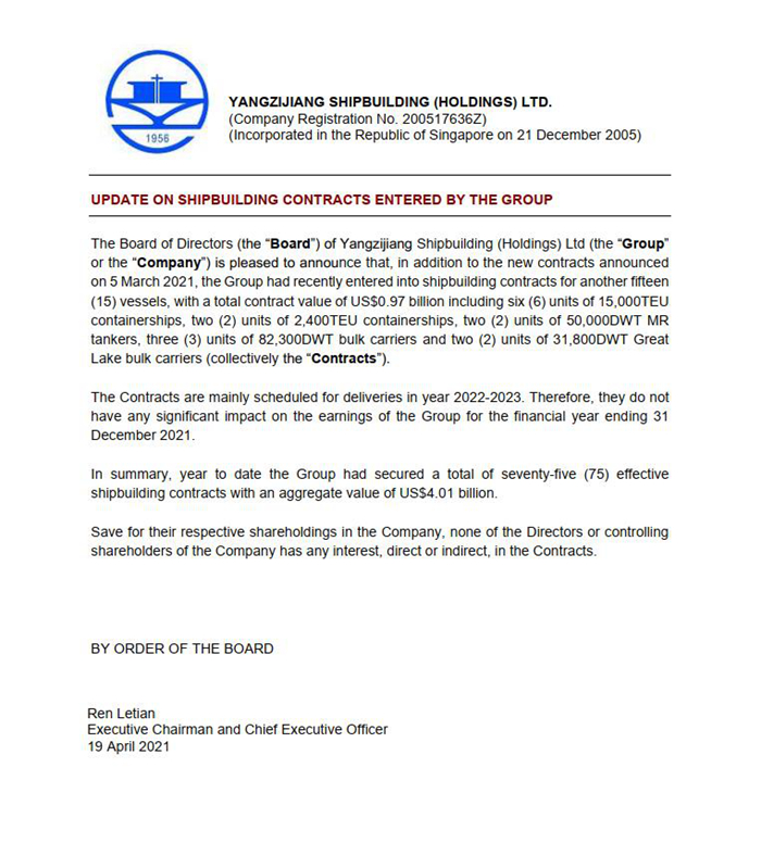 4月19日,上市公司發(fā)布公告,集團(tuán)近簽署了15艘、總價(jià)值達(dá)9.7億美元的新船建造合同。15艘新造船舶包括: