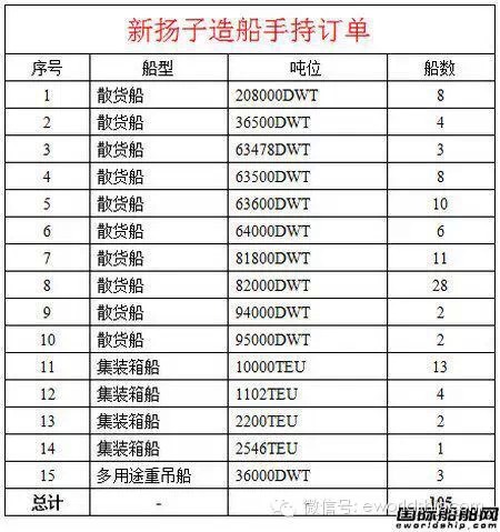 據(jù)國際船舶網(wǎng)了解,揚(yáng)子江船業(yè)2014年全年的新船訂單為41艘,訂單總額共計(jì)18億美元。此外,包括2艘10000TEU集裝箱船、2艘35000DWT散貨船和2艘2700TEU集裝箱船備選訂單延遲至2015年。